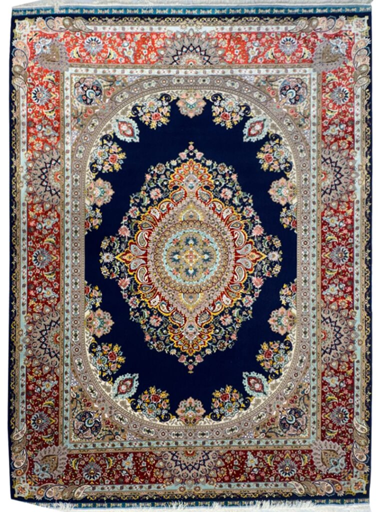 ربات بافت تبريز 250*350 مستطيل کف ساده صادق نژاد 50 رج پشم و ابريشم سورمهاي عنابي 20 Kg