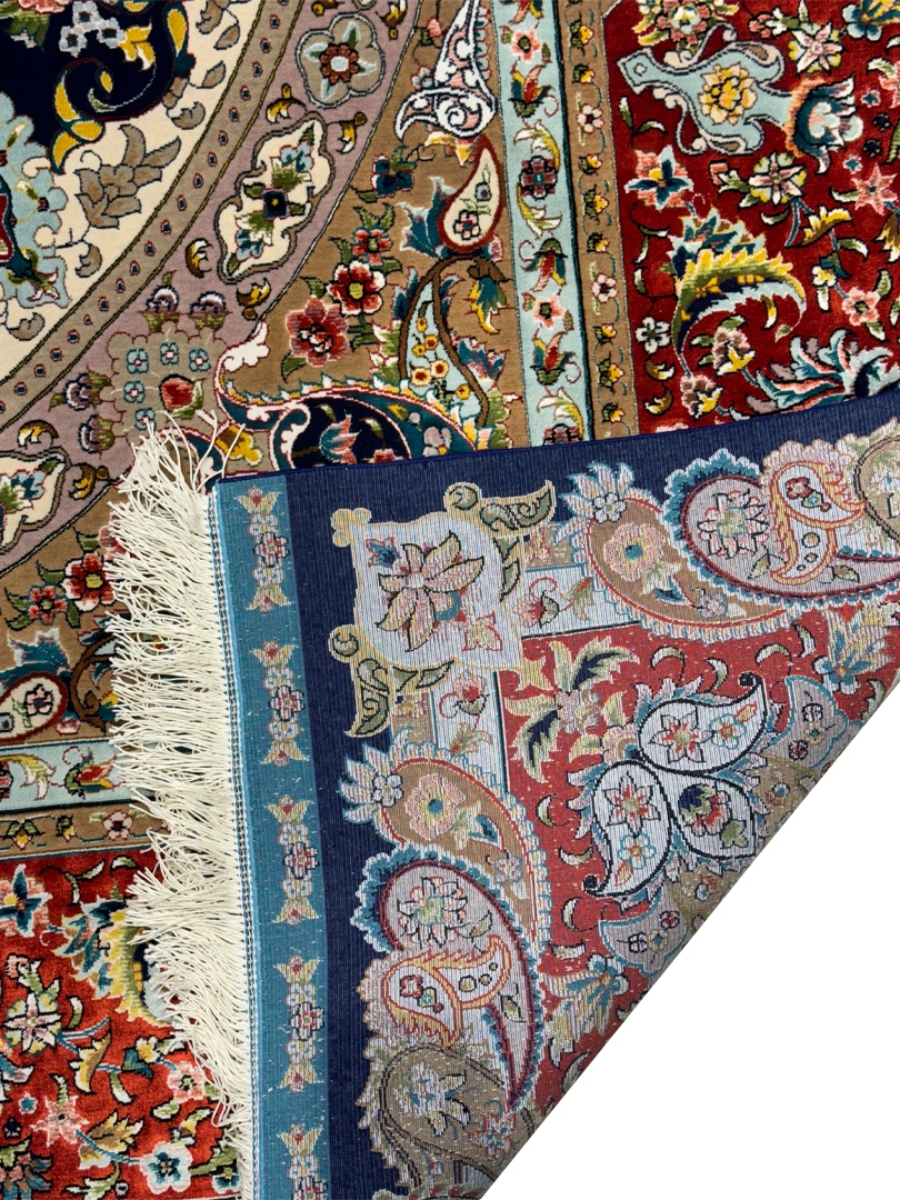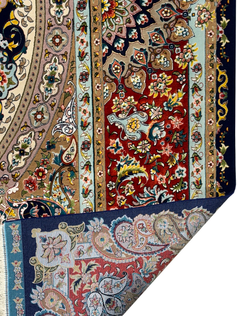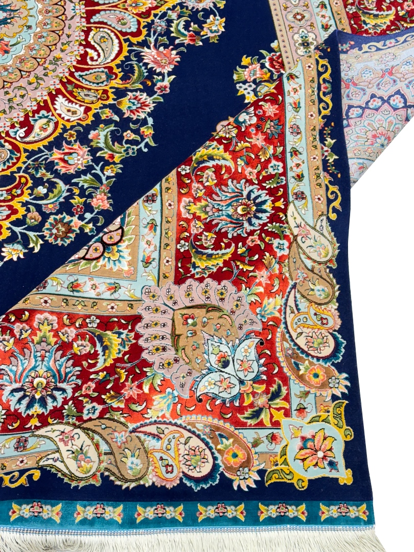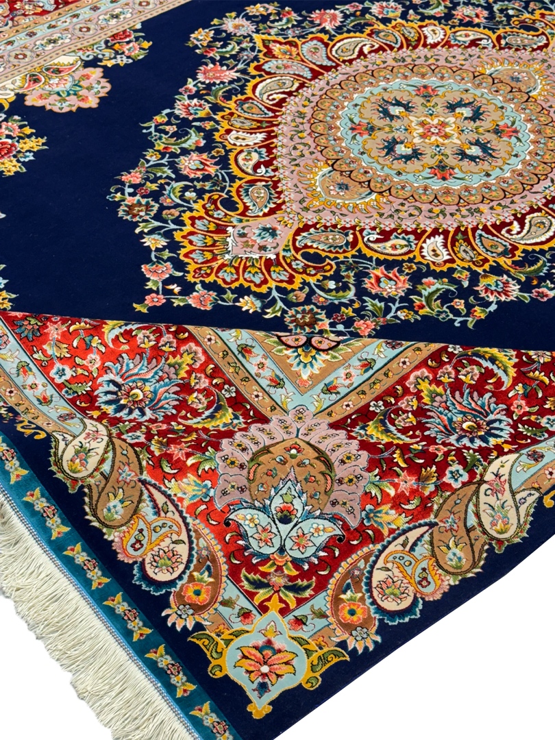 ربات بافت تبريز 250*350 مستطيل کف ساده صادق نژاد 50 رج پشم و ابريشم سورمهاي عنابي 20 Kg