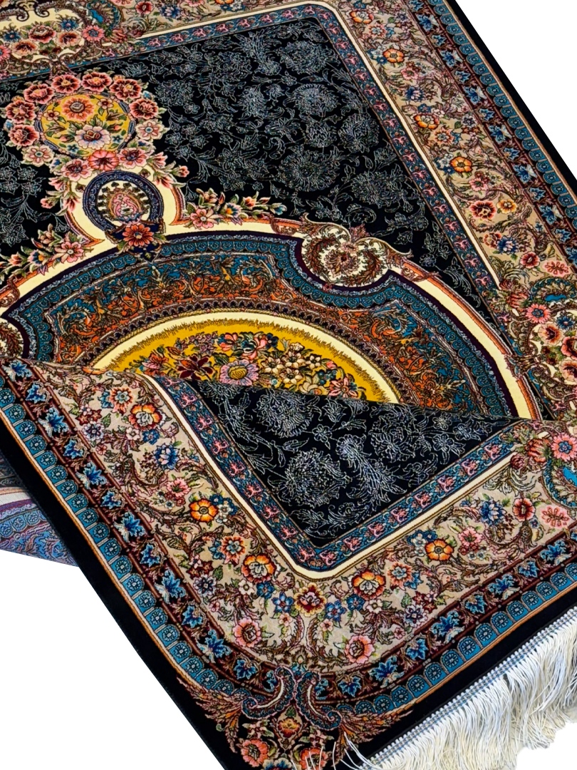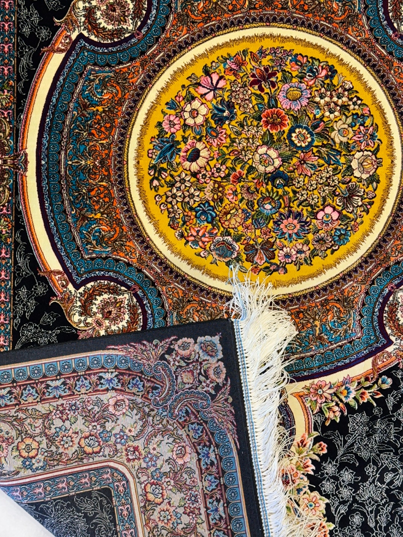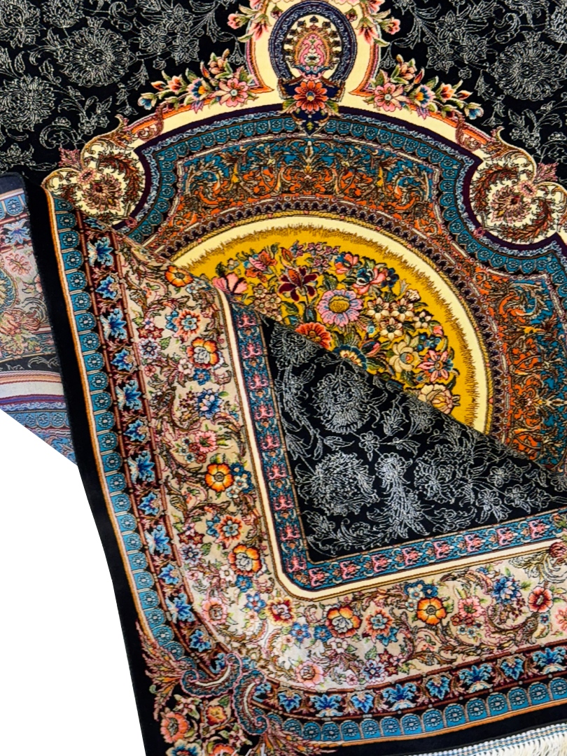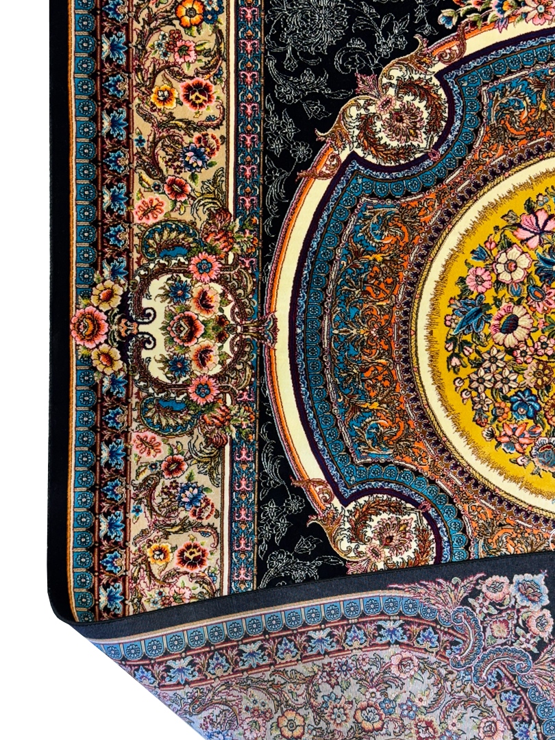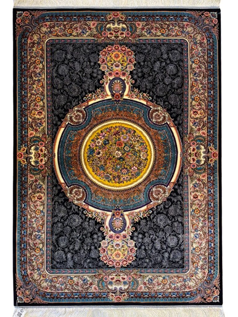 ربات بافت قم 100*150 مستطيل گلابتون 70 رج ابريشم و بنبوسيلک مشکي کرم 3 Kg