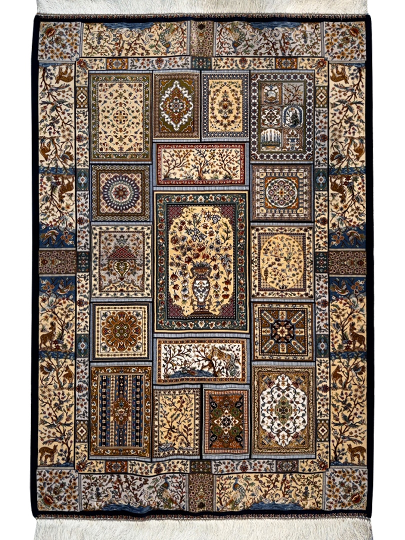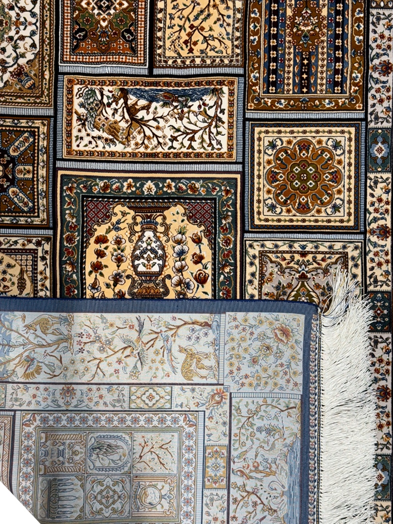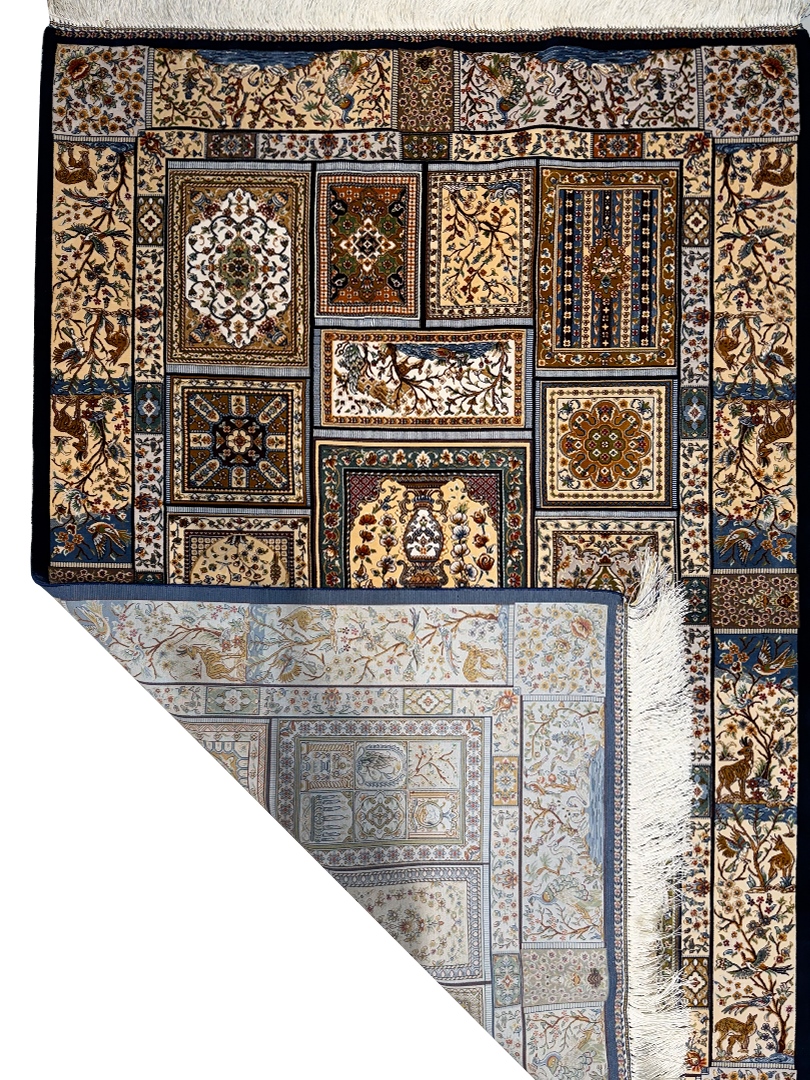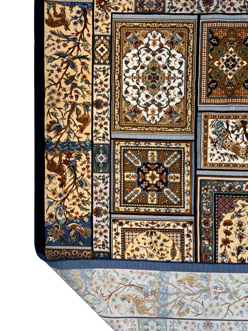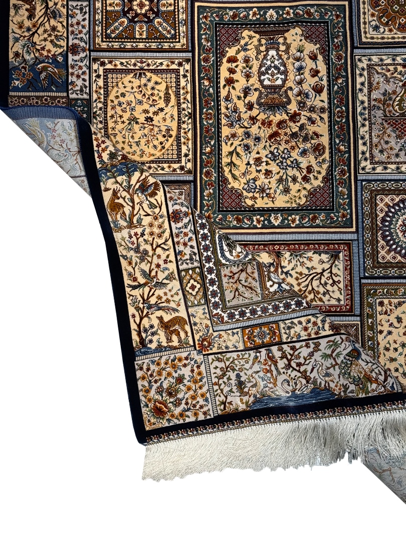 ربات بافت قم 100*150 مستطيل گلستان فرش تو فرش 70 رج تمام ابريشم کرم سورمه‌اي 2 Kg