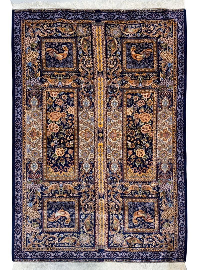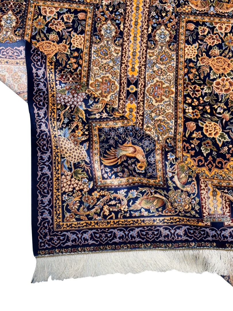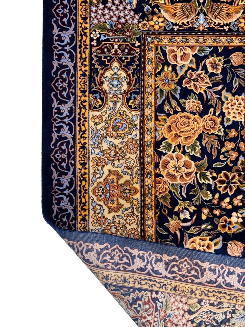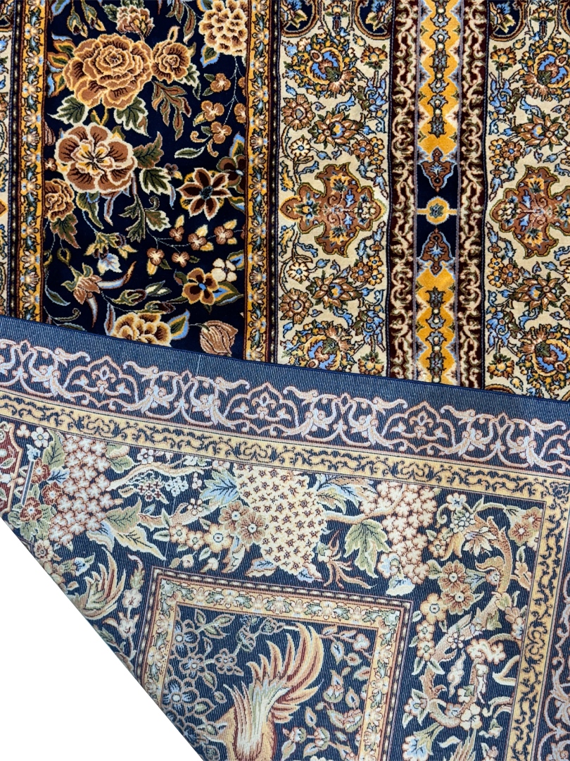 ربات بافت قم 120*180 مستطيل گلستان قابي 70 رج تمام ابريشم سورمه‌اي سورمه‌اي 2 Kg