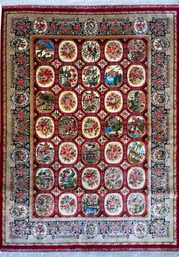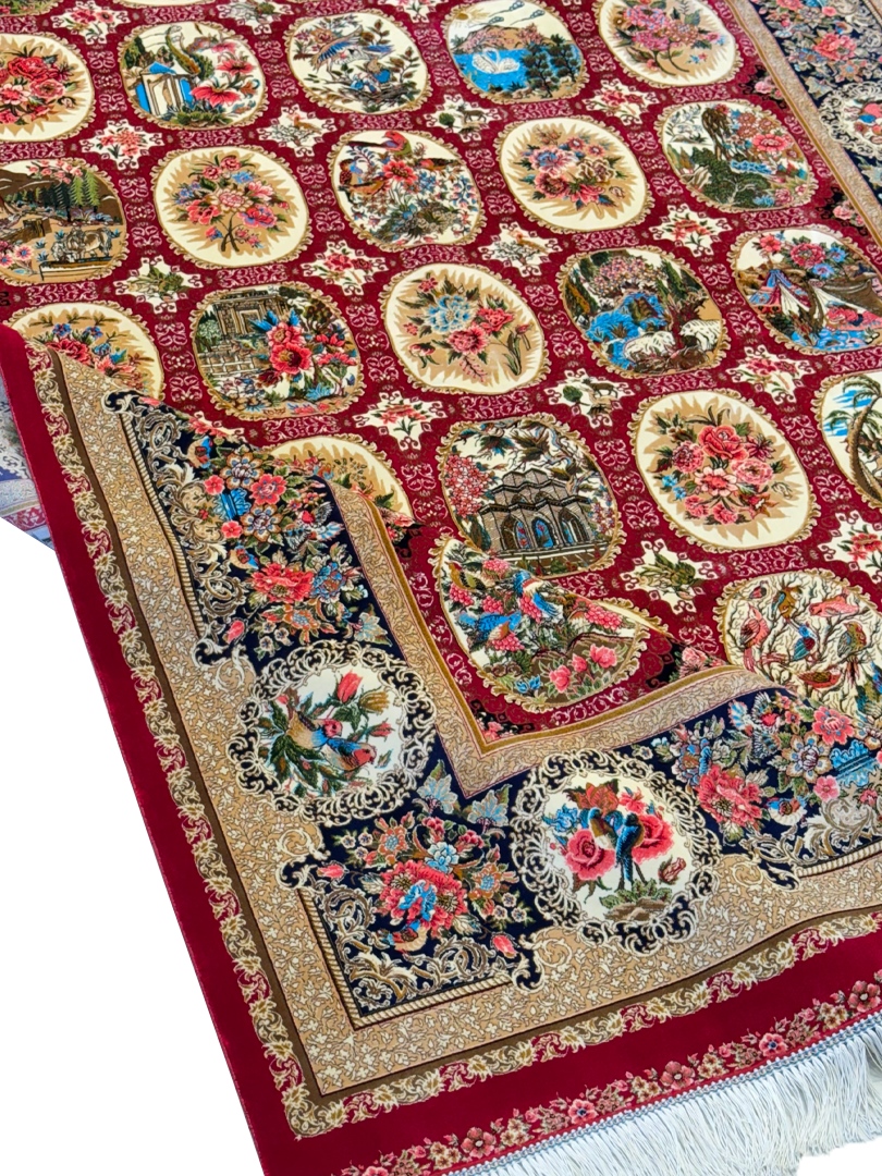 ربات بافت قم 150*225 مستطيل گلستان قابي 70 رج ابريشم و بنبوسيلک شرابي کرم شرابي 7 Kg