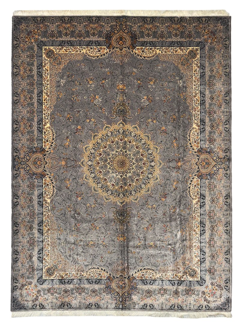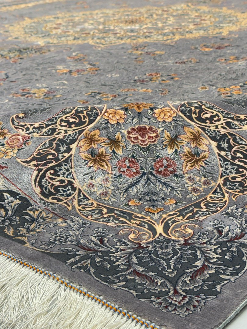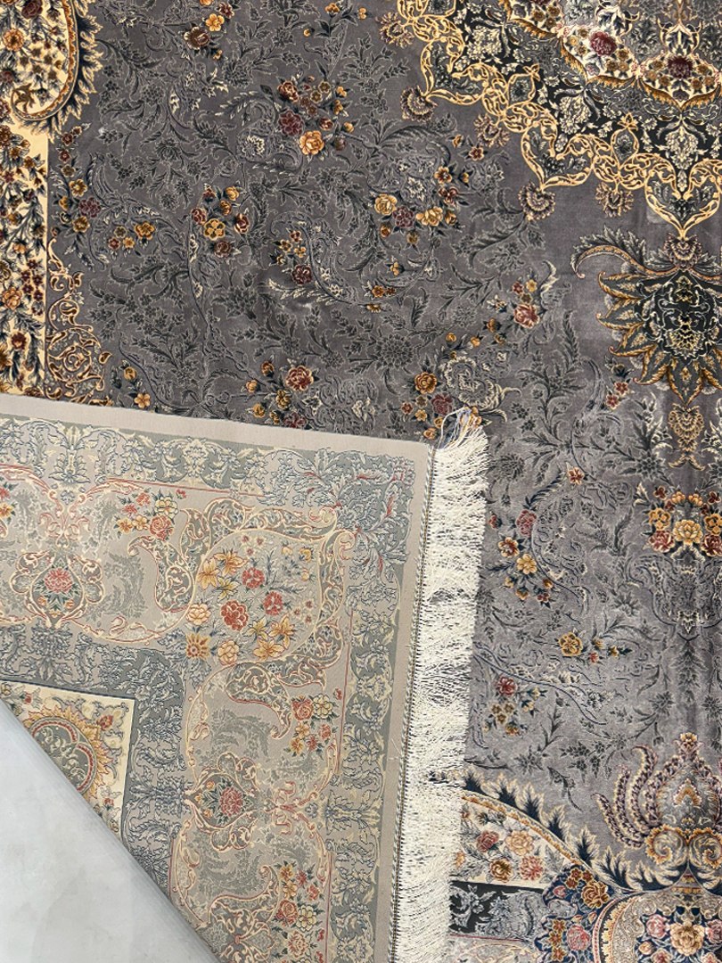 ربات بافت تمام ابريشم 2 نخ 300*400 مستطيل گل فرنگ 70 رج پشم و بنبوسيلک نقره ابي ابي نقره اي 30 Kg