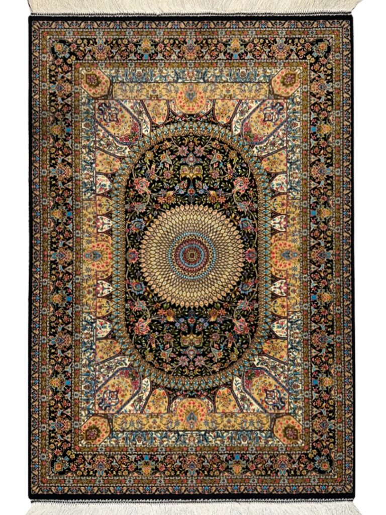 ربات بافت قم 80*120 مستطيل گنبدي اسليمي 70 رج ابريشم و بنبوسيلک مشکي کرم الوان kg1