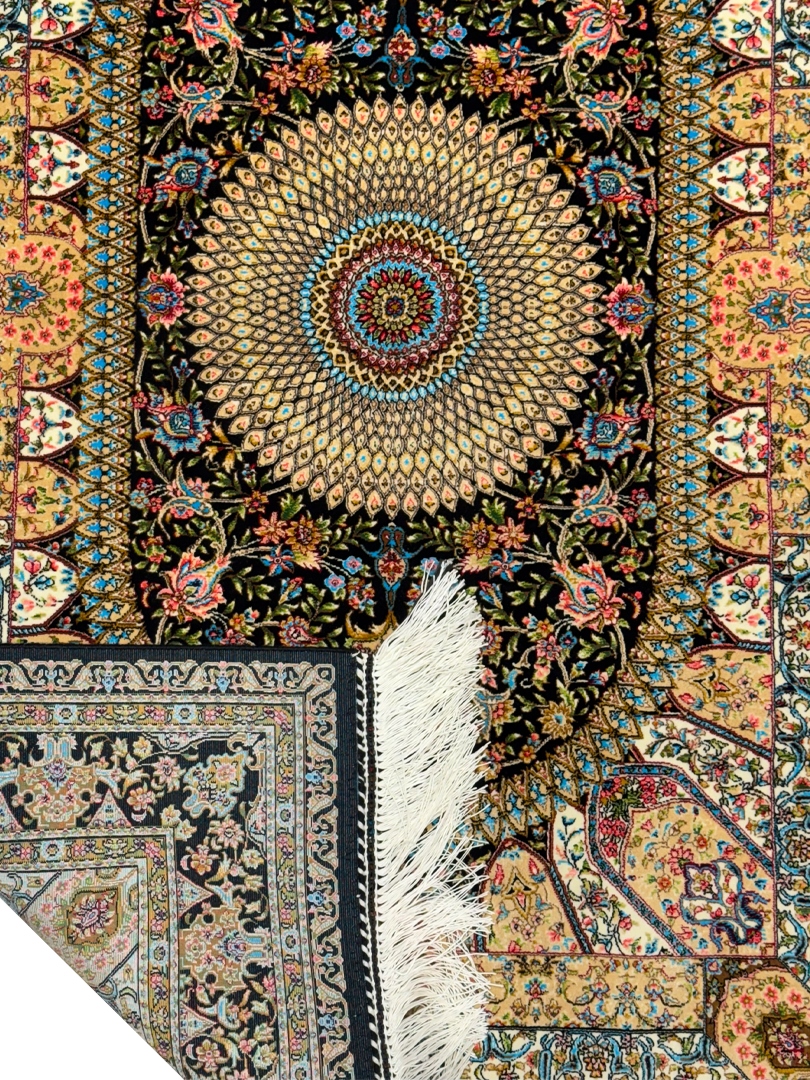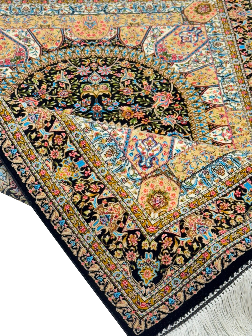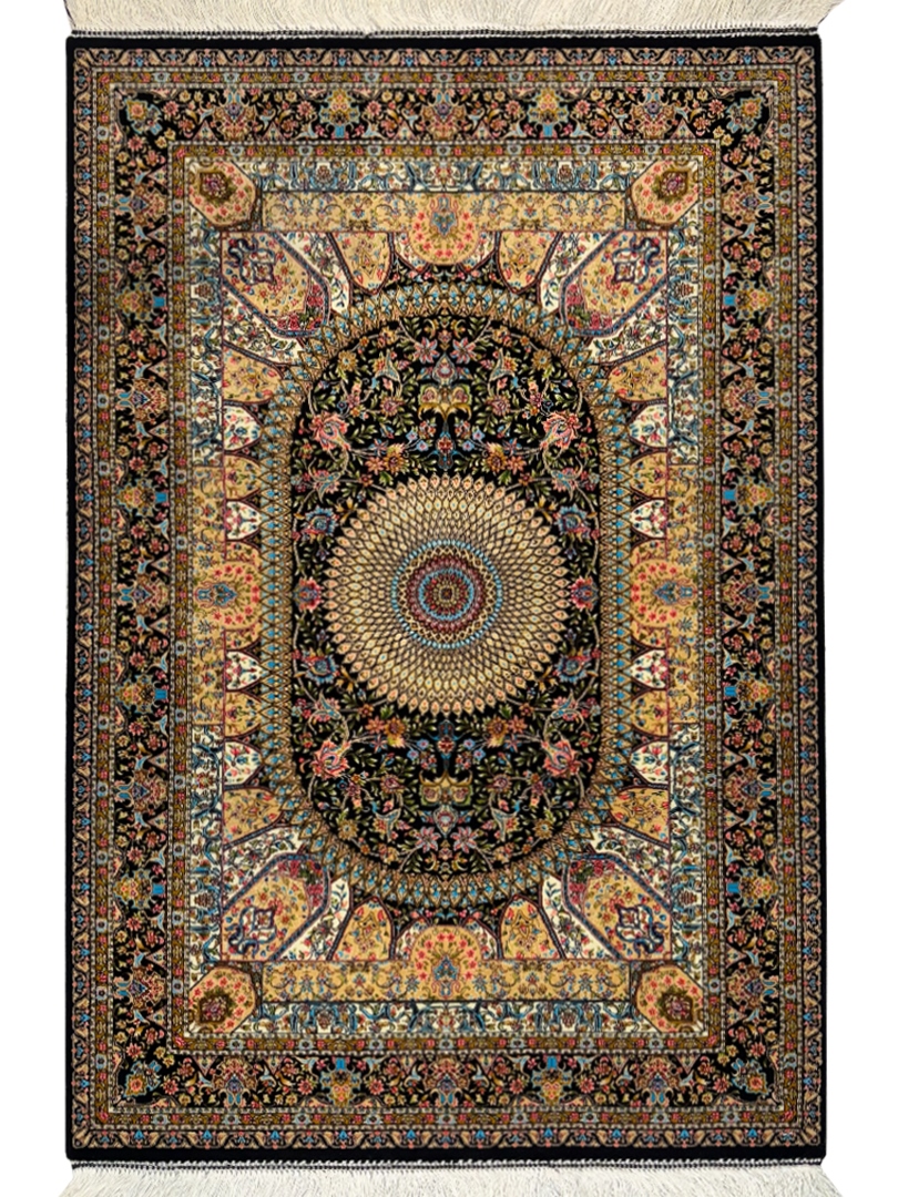 ربات بافت قم 80*120 مستطيل گنبدي اسليمي 70 رج ابريشم و بنبوسيلک مشکي کرم الوان kg1