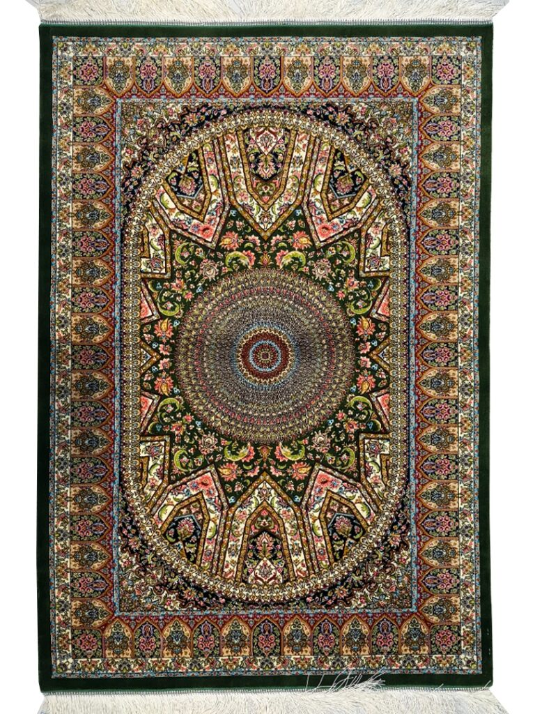 ربات بافت قم 80*120 مستطيل گنبدي اسليمي 70 رج ابريشم و بنبوسيلک سبز الوان الوان kg1