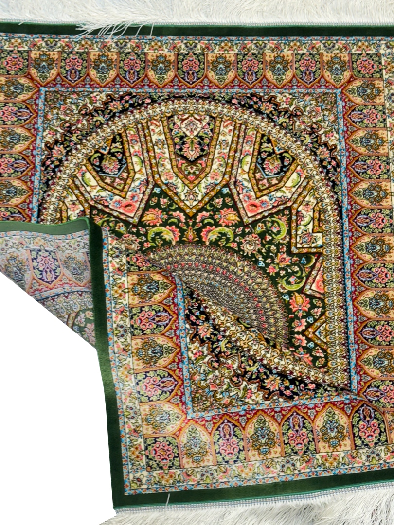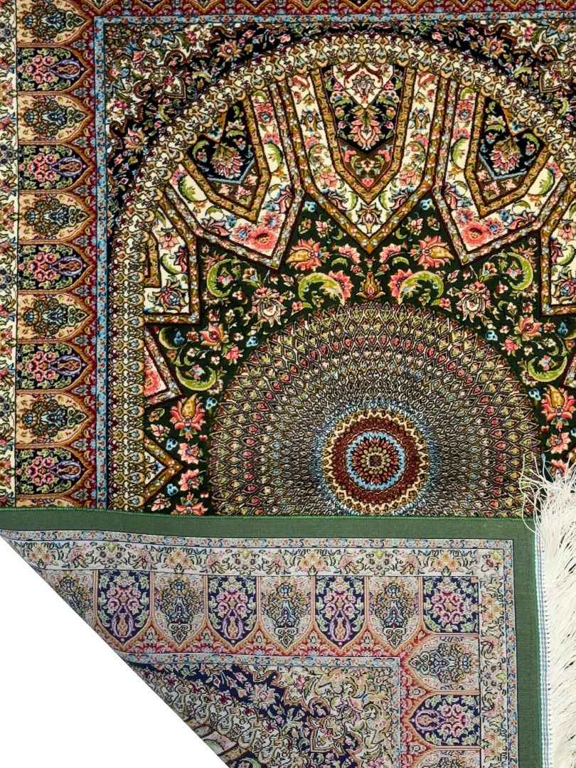 ربات بافت قم 80*120 مستطيل گنبدي اسليمي 70 رج ابريشم و بنبوسيلک سبز الوان الوان kg1