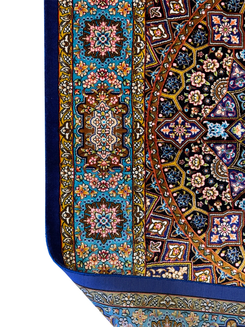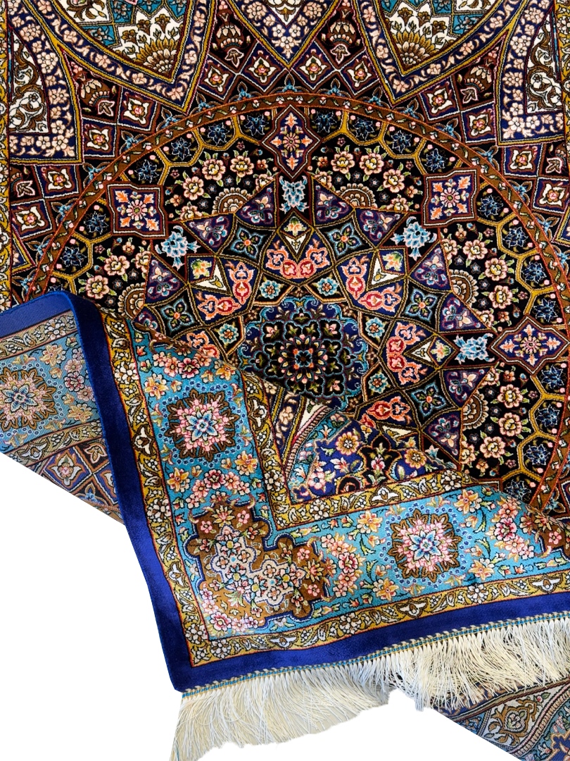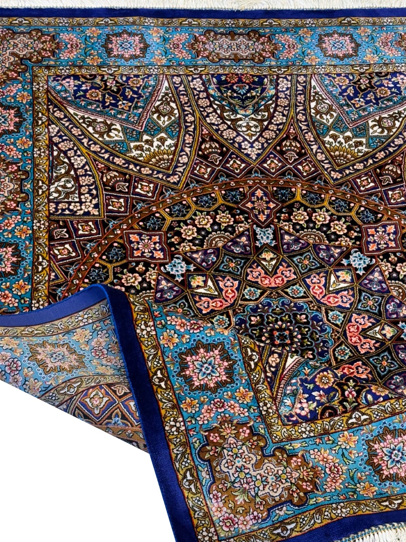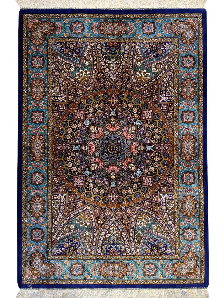ربات بافت قم 100*150 مستطيل گنبدي اسليمي 70 رج ابريشم و بنبوسيلک مشکي الوان سورمهاي 3 Kg