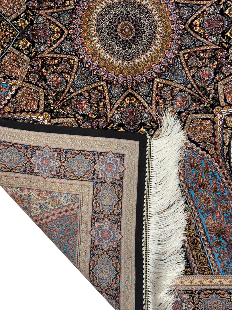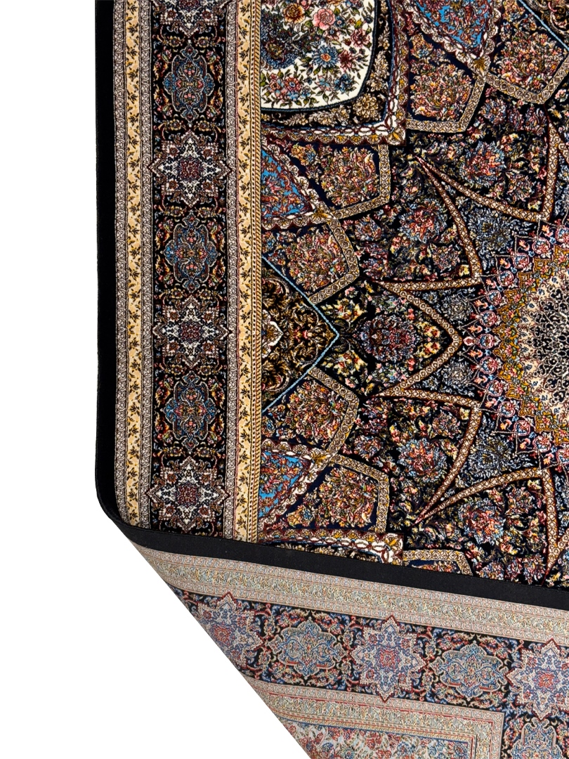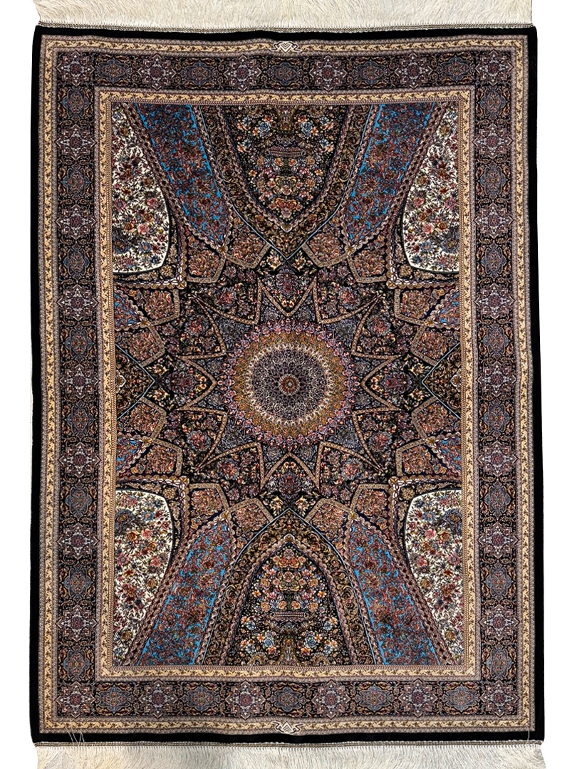 ربات بافت قم 100*150 مستطيل گنبدي اسليمي 70 رج تمام ابريشم الوان مشکي 2 Kg