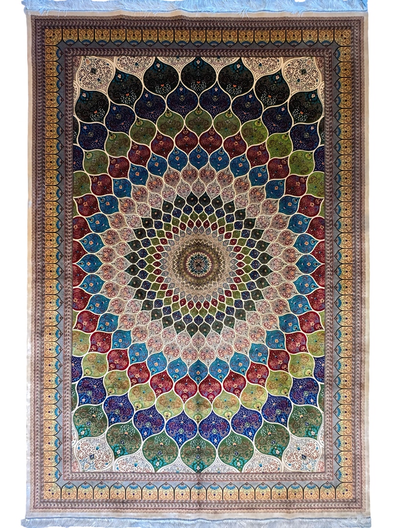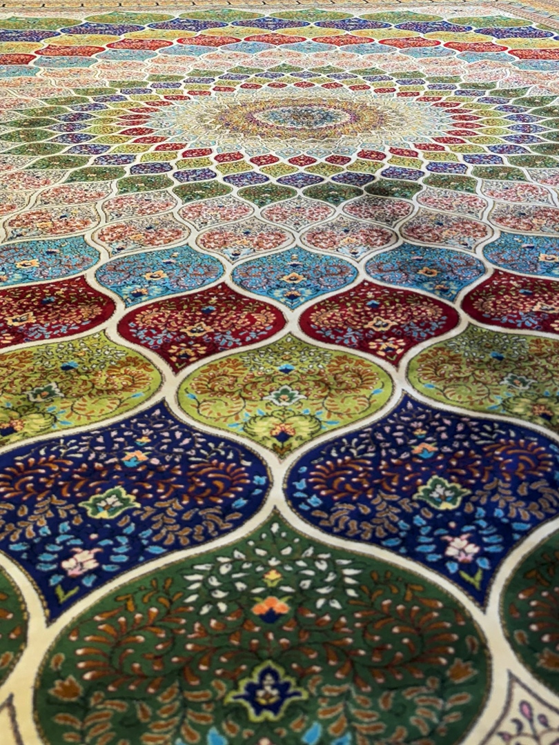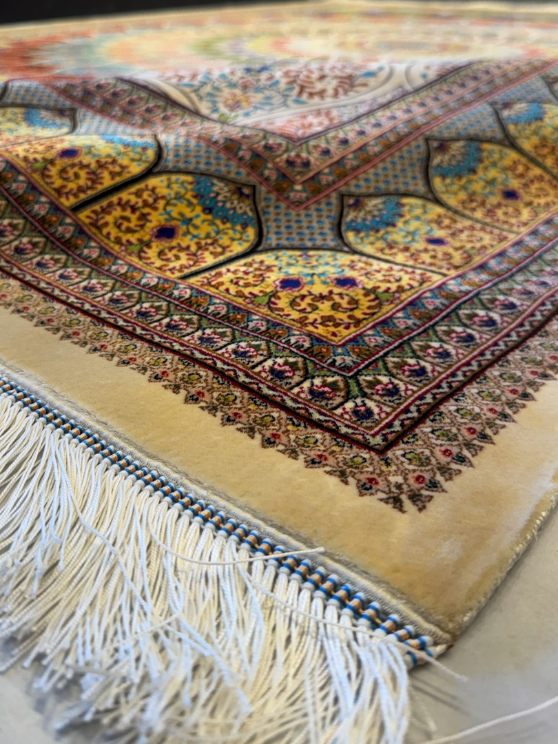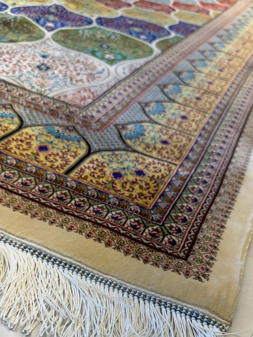 ربات بافت قم 200*300 مستطيل گنبدي 70 رج ابريشم و بنبوسيلک الوان کرم 17 Kg