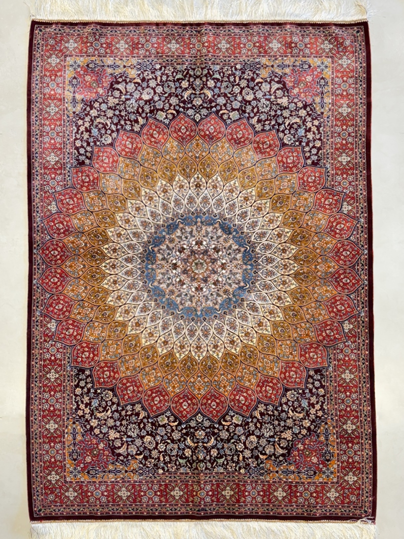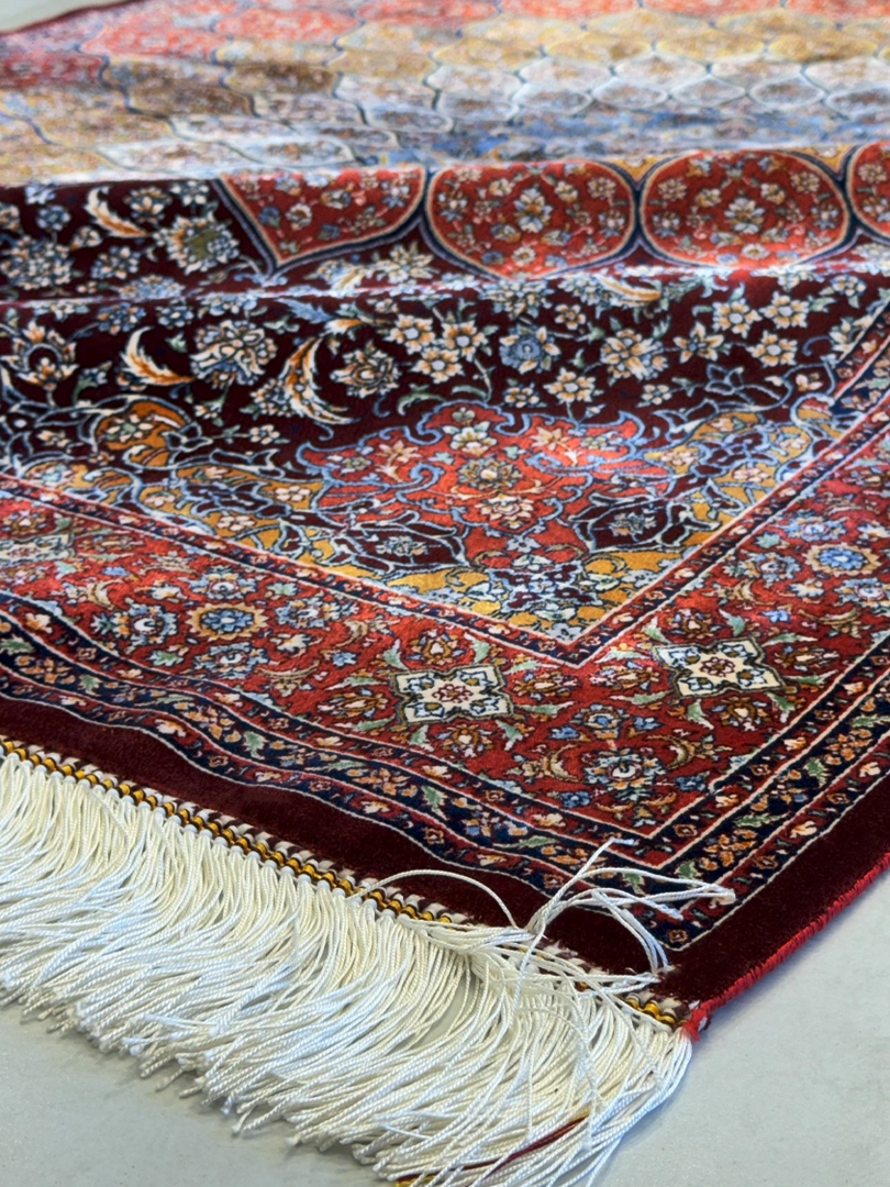 ربات بافت قم 120*180 مستطيل گنبدي 70 رج ابريشم و بنبوسيلک کرم عنابي عنابي 5 Kg