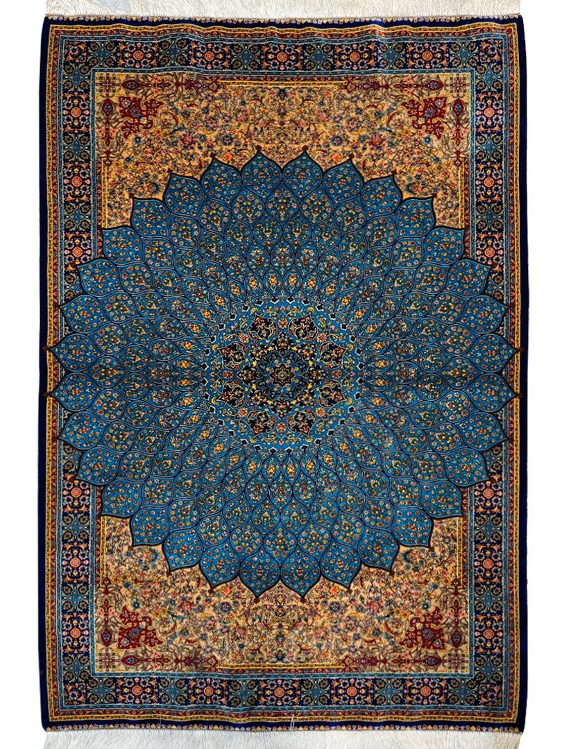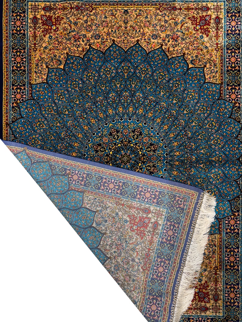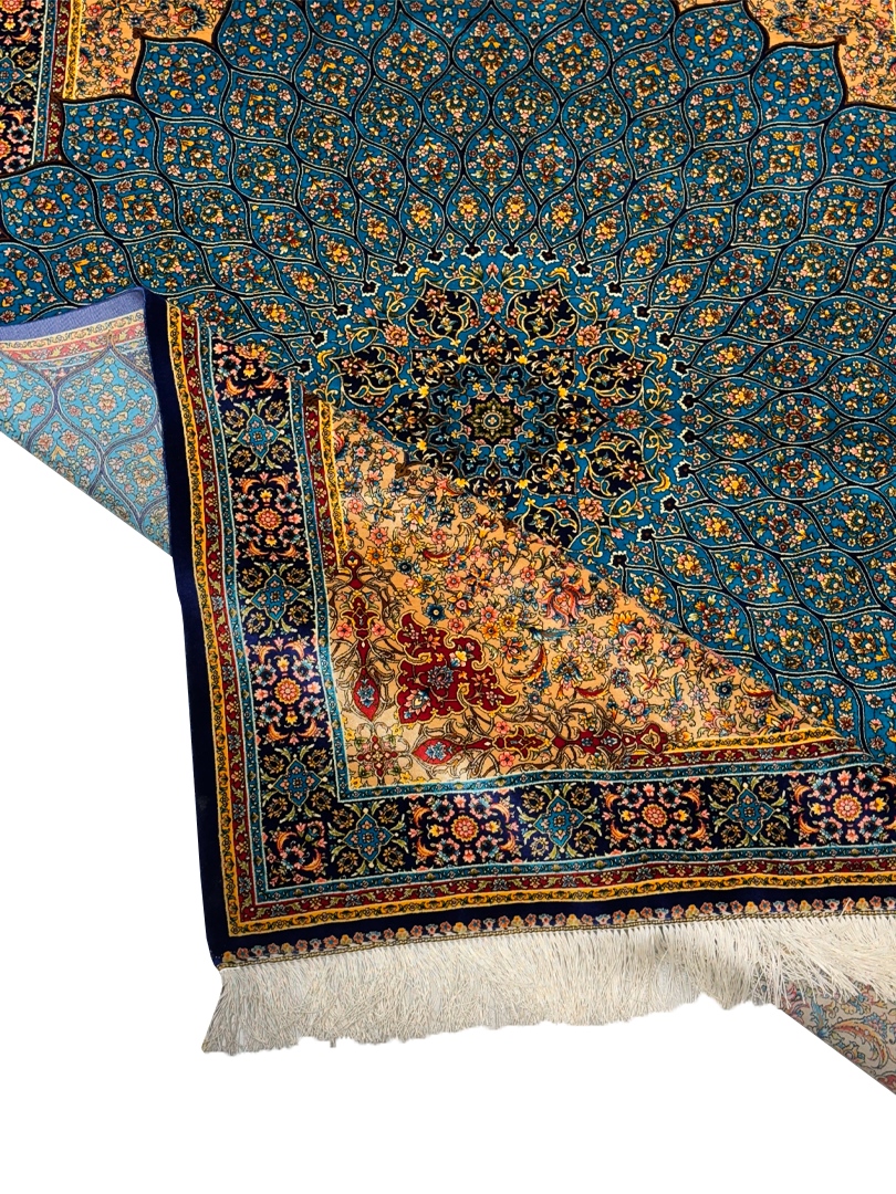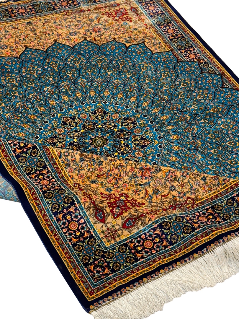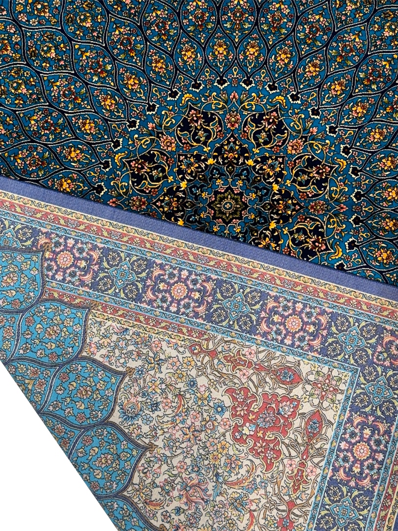 ربات بافت قم 120*180 مستطيل گنبدي 70 رج تمام ابريشم فيروزه اي سورمه‌اي 2 Kg