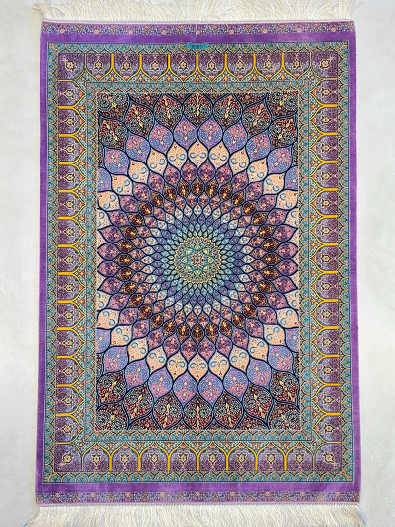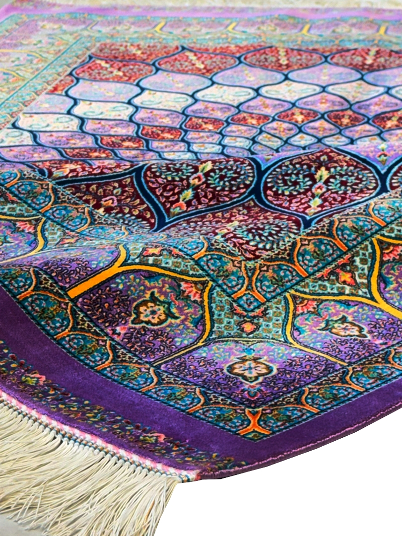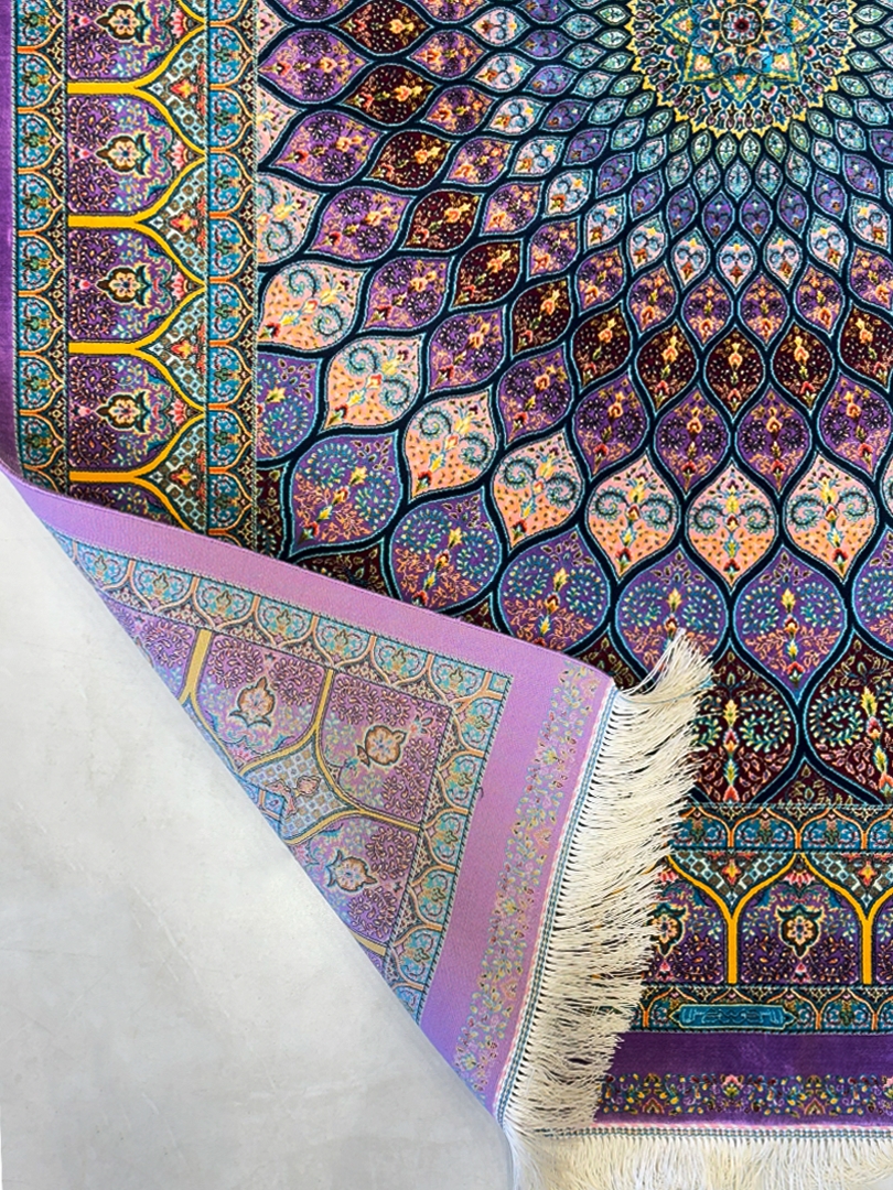 ربات بافت قم 100*150 مستطيل گنبد شهسوارپور 70 رج ابريشم و بنبوسيلک ياسي کرم الوان 3 Kg