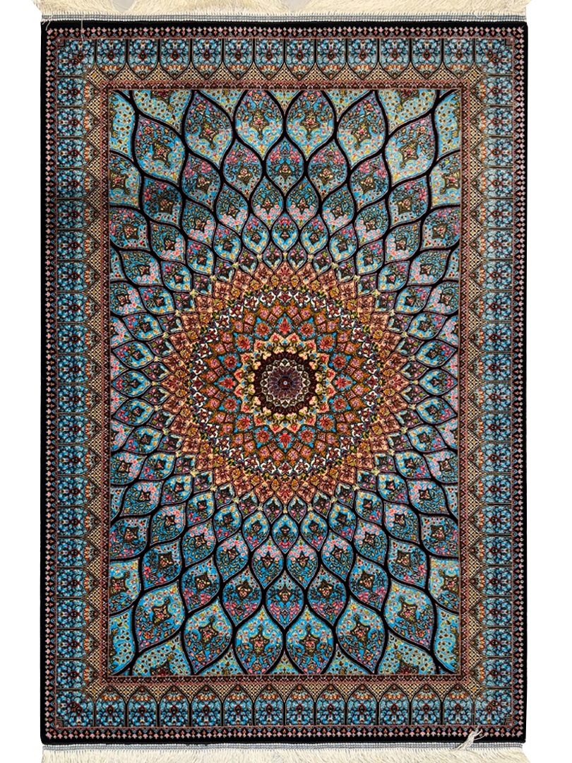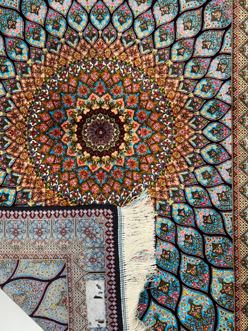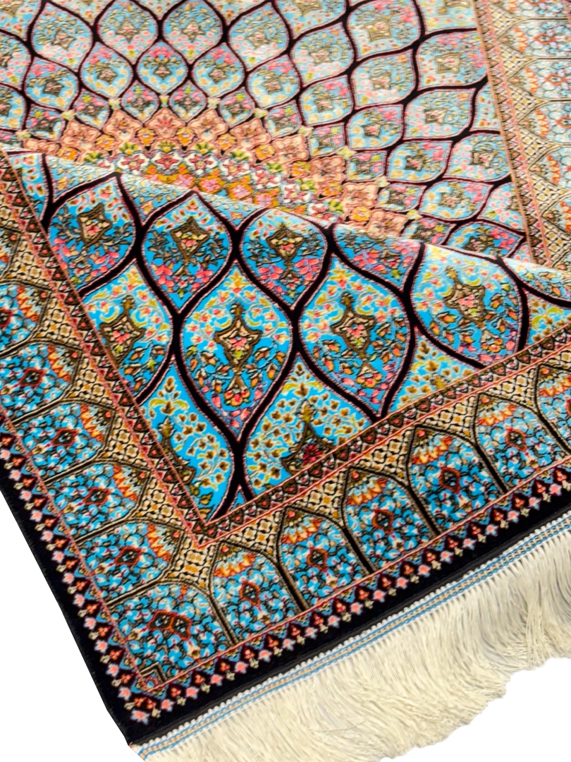 ربات بافت قم 80*120 مستطيل گنبد شهسوارپور 70 رج ابريشم و بنبوسيلک ابي فيروزه اي و بژ ابي الوان kg1