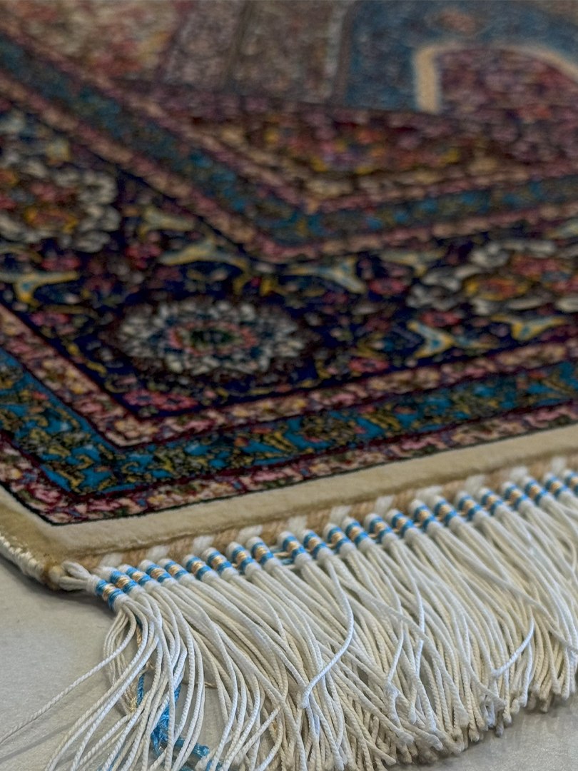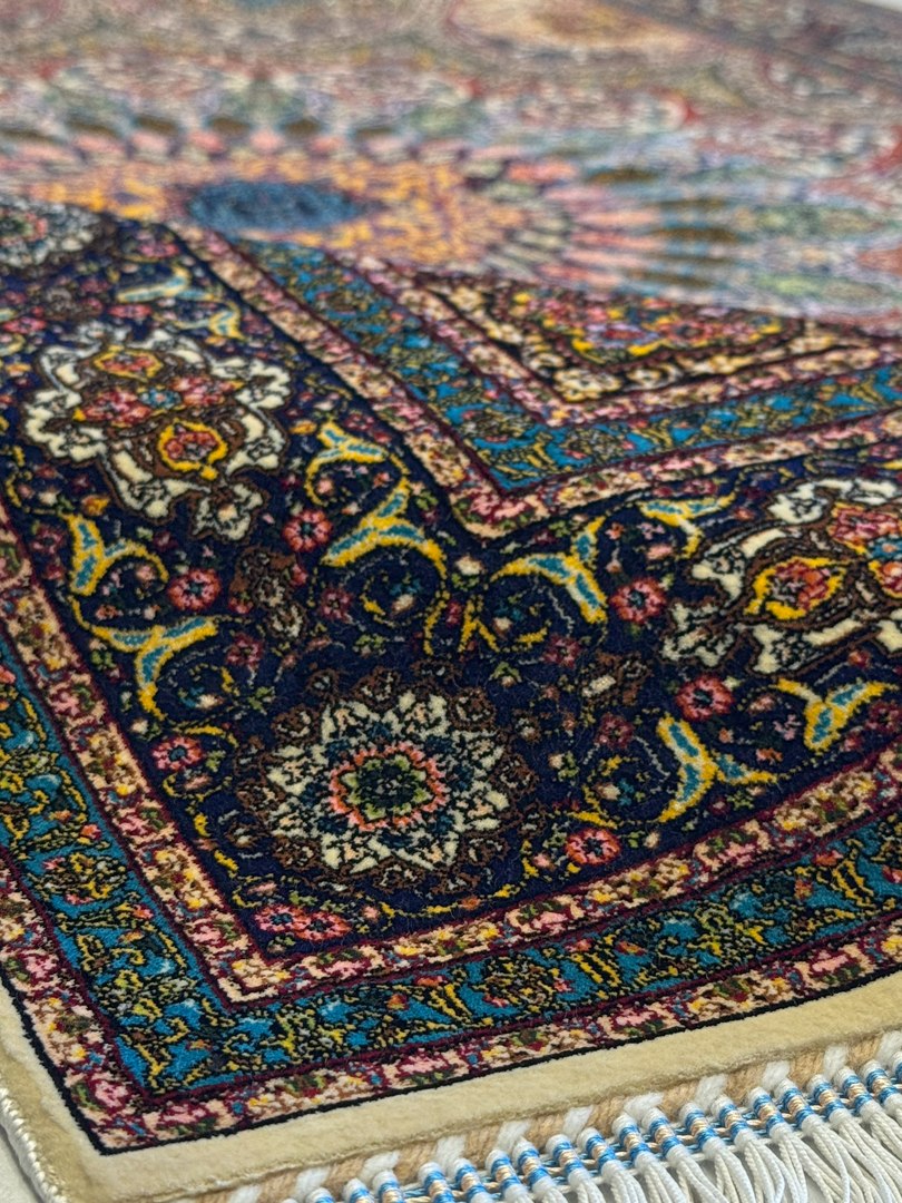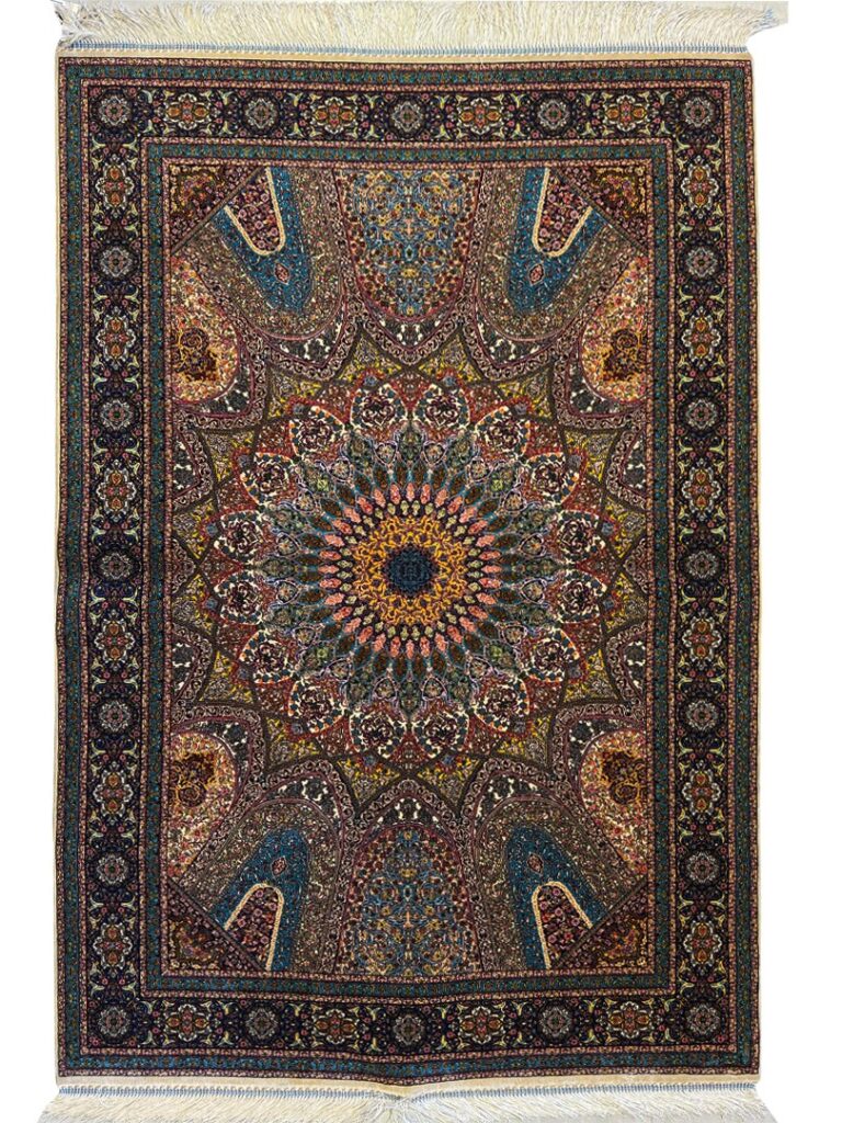 فرش ربات بافت قم 100*150 مستطيل گنبد شهسوارپور 70 رج ابريشم و بنبوسيلک کرم سورمهاي 3 Kg