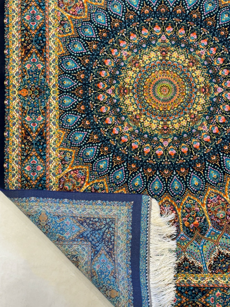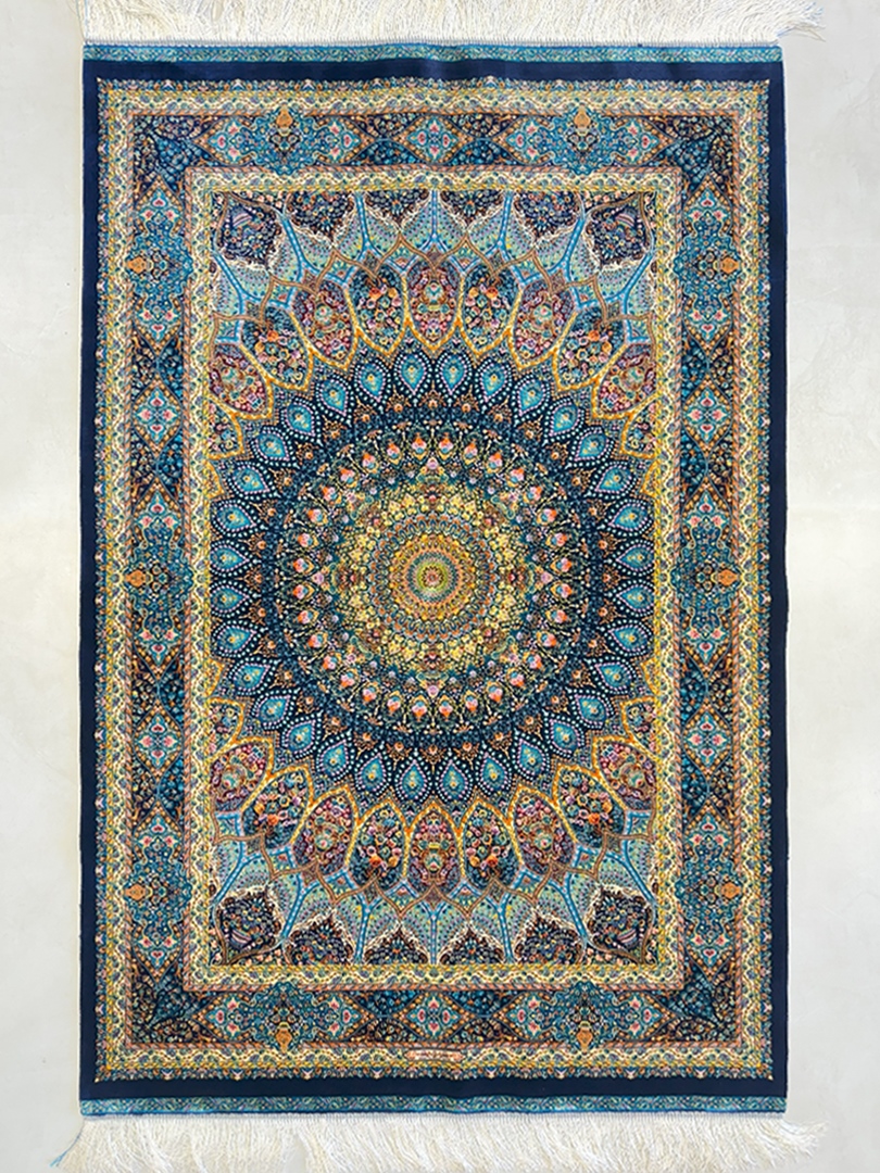ربات بافت قم 100*150 مستطيل گنبد شيخ لطف الله 70 رج ابريشم و بنبوسيلک سورمهاي سورمه ايي 17 Kg