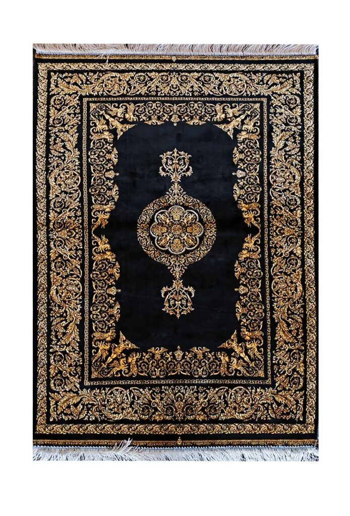 ربات بافت قم 100*150 مستطيل ورساچه ترنجي 70 رج ابريشم و بنبوسيلک مشکي مشکي طلايي 3 Kg