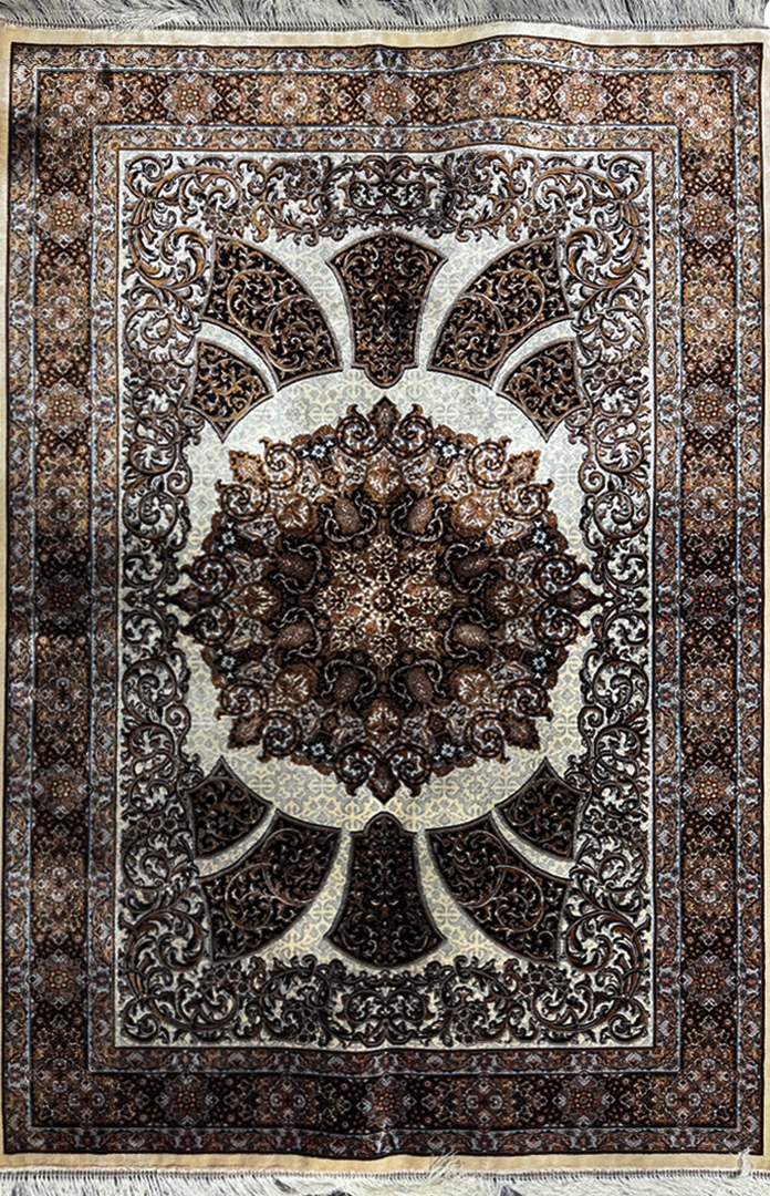 ربات بافت قم 100*150 مستطيل ورساچه ترنجي 70 رج ابريشم و بنبوسيلک کرم دارچيني کرم شيري 3 Kg