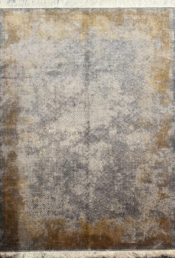 ربات بافت تمام ابريشم 2 نخ 150*225 مستطيل پتينه هندسي 70 رج پشم و بنبوسيلک طوسي کرم طوسي 7 Kg
