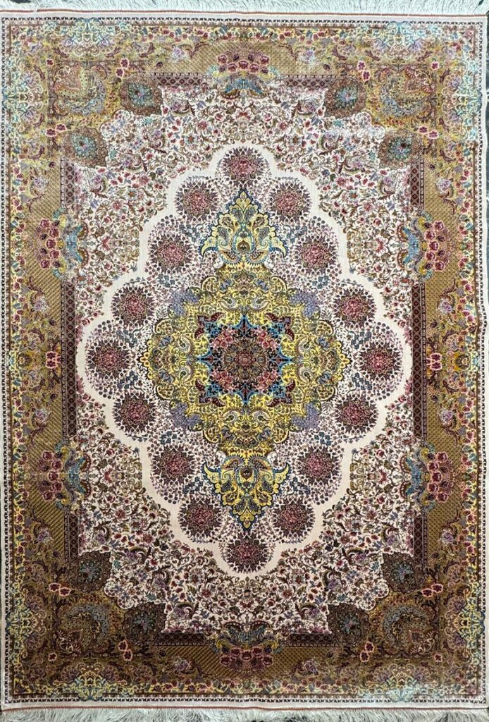 ربات بافت قم 150*225 مستطيل لچک ترنجي چرخ و فلک 70 رج ابريشم و بنبوسيلک کرم و آبي الوان 4 Kg
