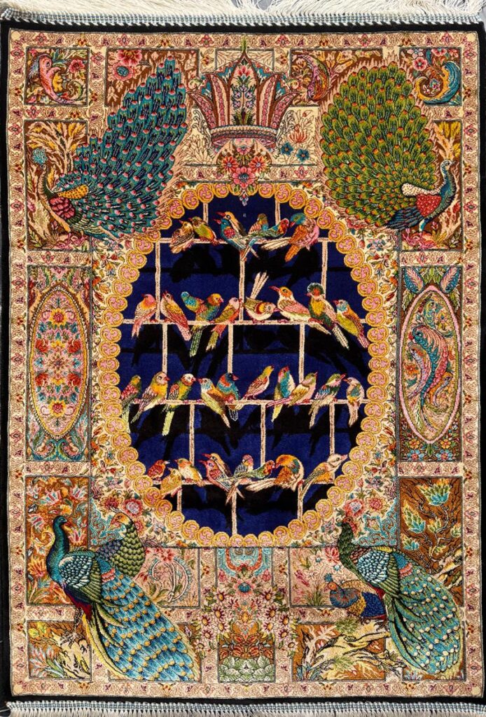 ربات بافت قم 60 * 90 مستطيل چهل طوطي قابي 70 رج ابريشم و بنبوسيلک کرم سورمه ايي مشکي Kg 1