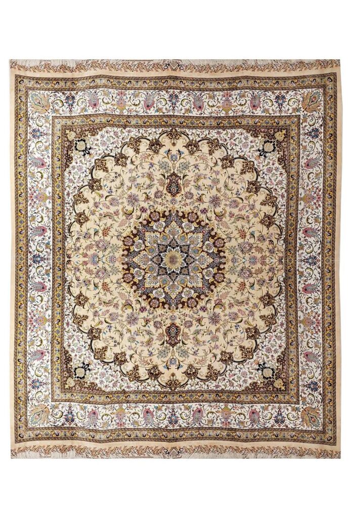 ربات بافت قم 200*250 مستطيل گل فرنگ 70 ابريشم و بنبوسيلک کرم کرم – قهوهاي 23 Kg فرش شادکام
