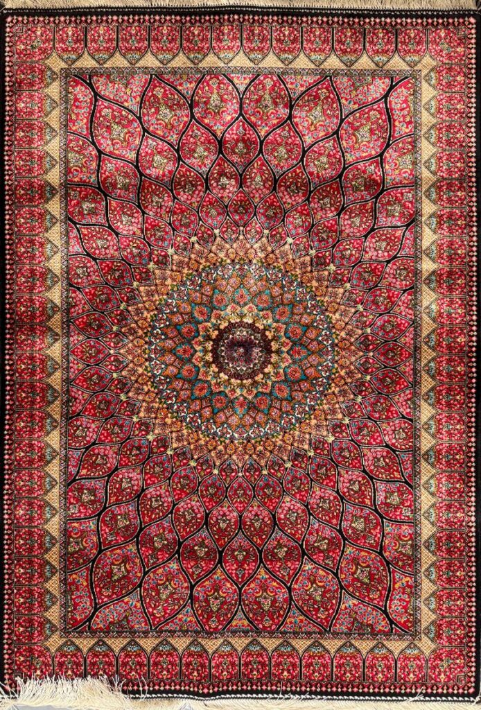 ربات بافت قم 60 * 90 مستطيل گنبدي 70 رج ابريشم و بنبوسيلک شرابي مشکي 3 Kg
