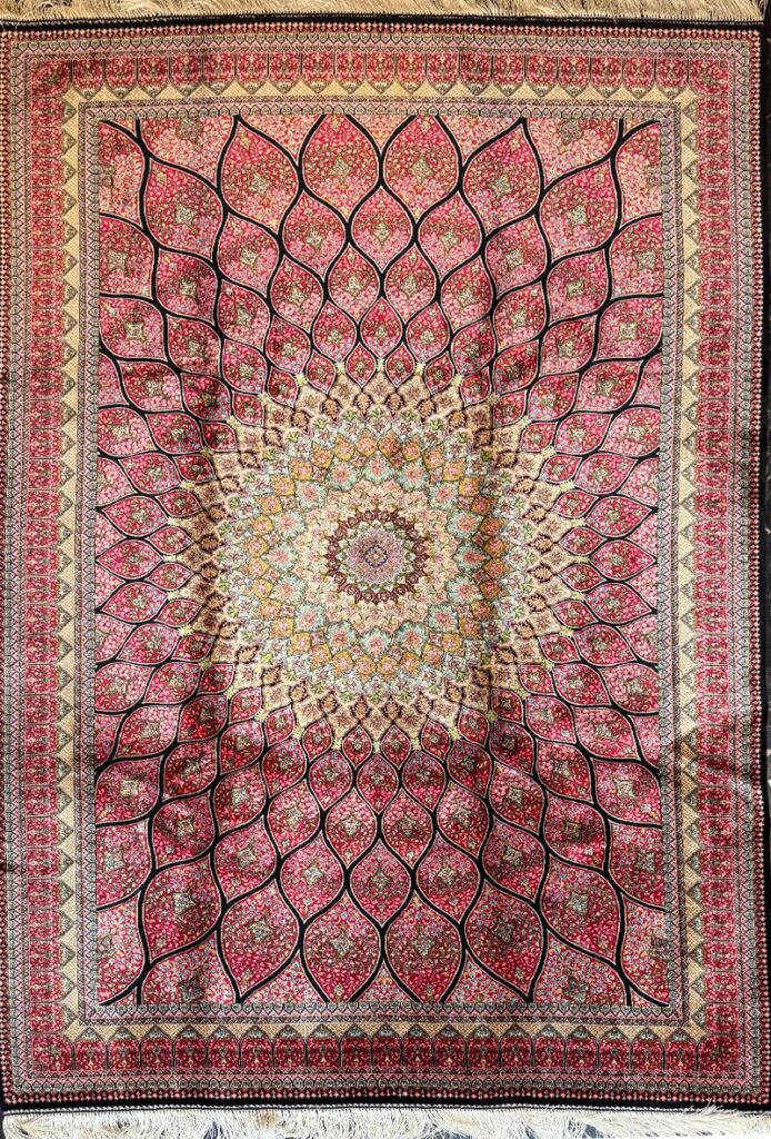 ربات بافت قم 120*180 مستطيل گنبدي 70 رج ابريشم و بنبوسيلک شرابي مشکي 5 Kg
