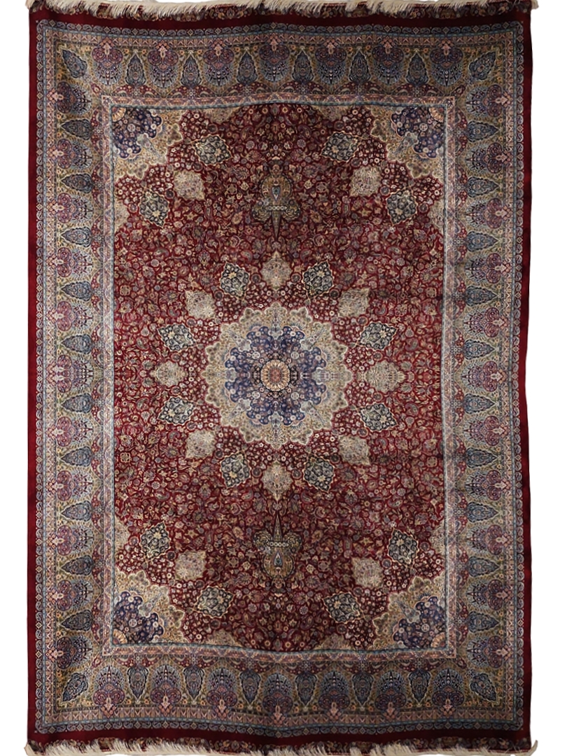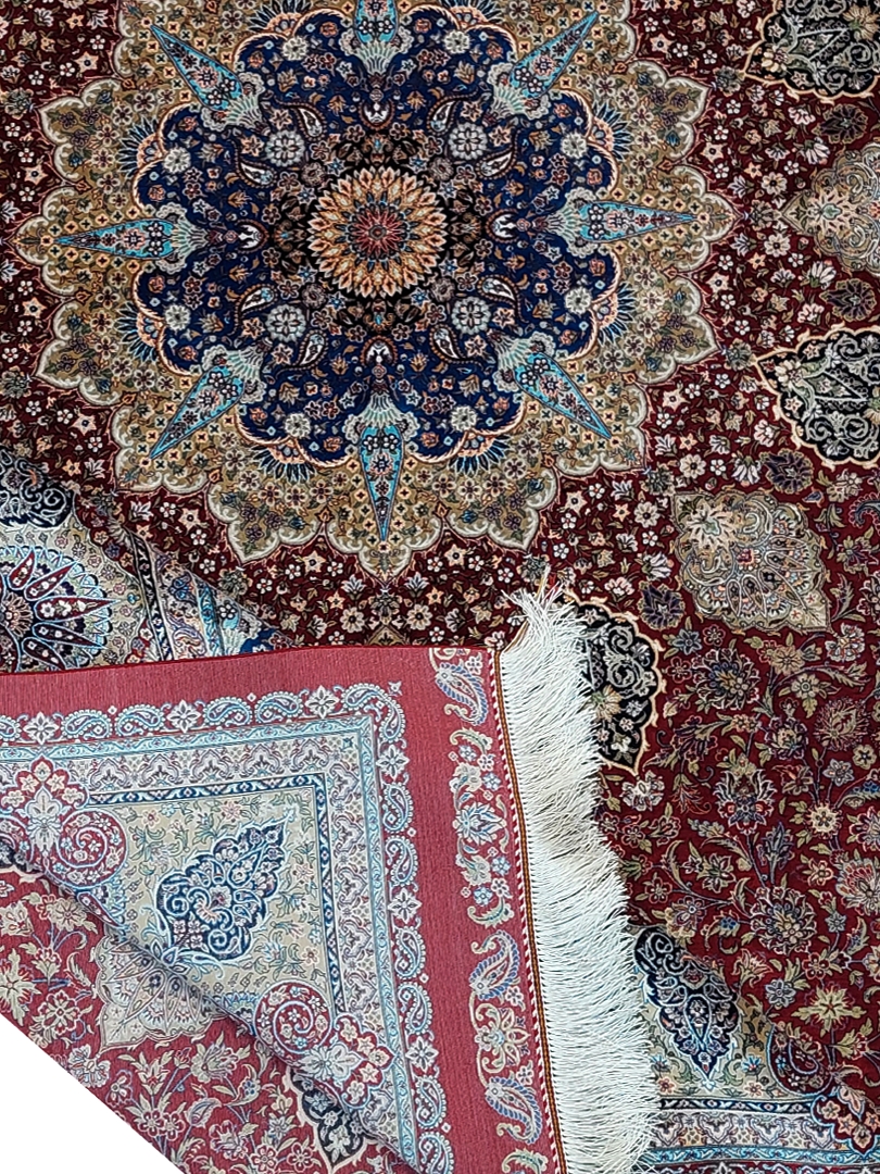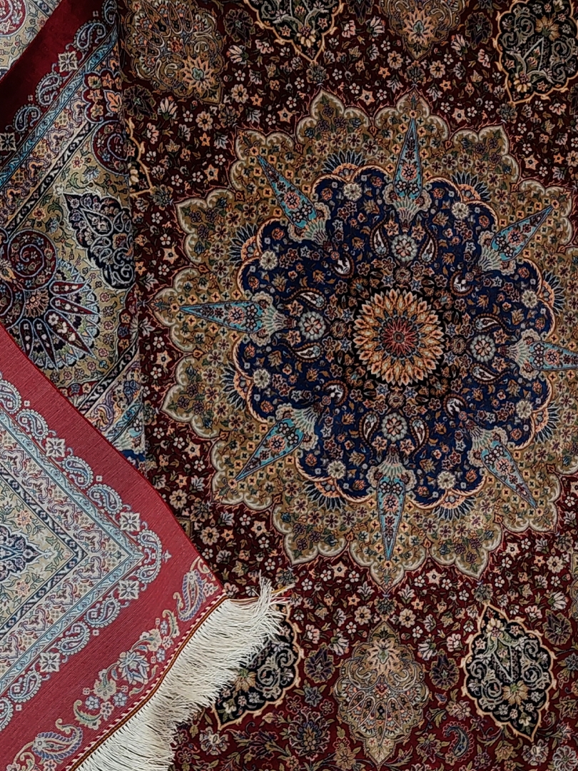ربات بافت قم 200*300 مستطيل * شاه عباسي 70 ابريشم و بنبوسيلک زرشکي نسکافه‌اي 18 Kg