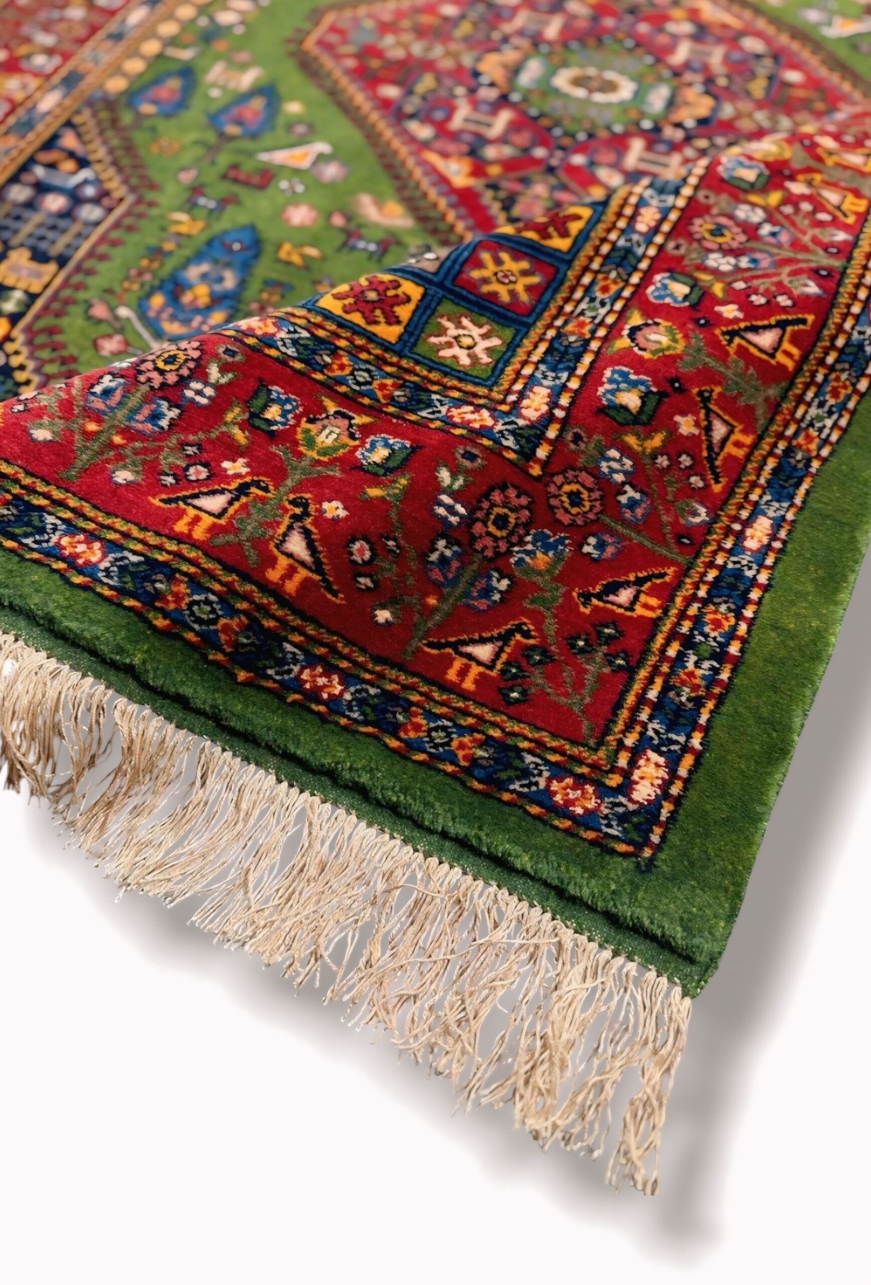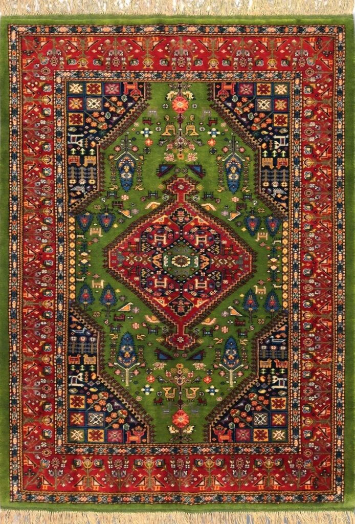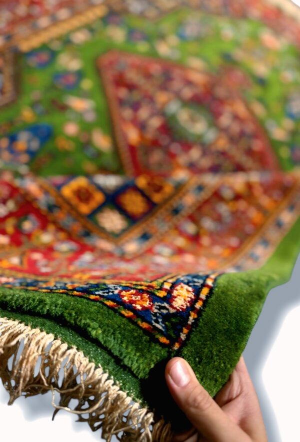 دست بافت قشقايي 120*180 مستطيل سروي ترنجي 40 رج پشم سبز لاکي 8 Kg